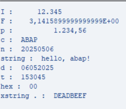 lv_n TYPE N LENGTH 8 VALUE '20250506', " 숫자 문자열 (숫자만 입력 가능)