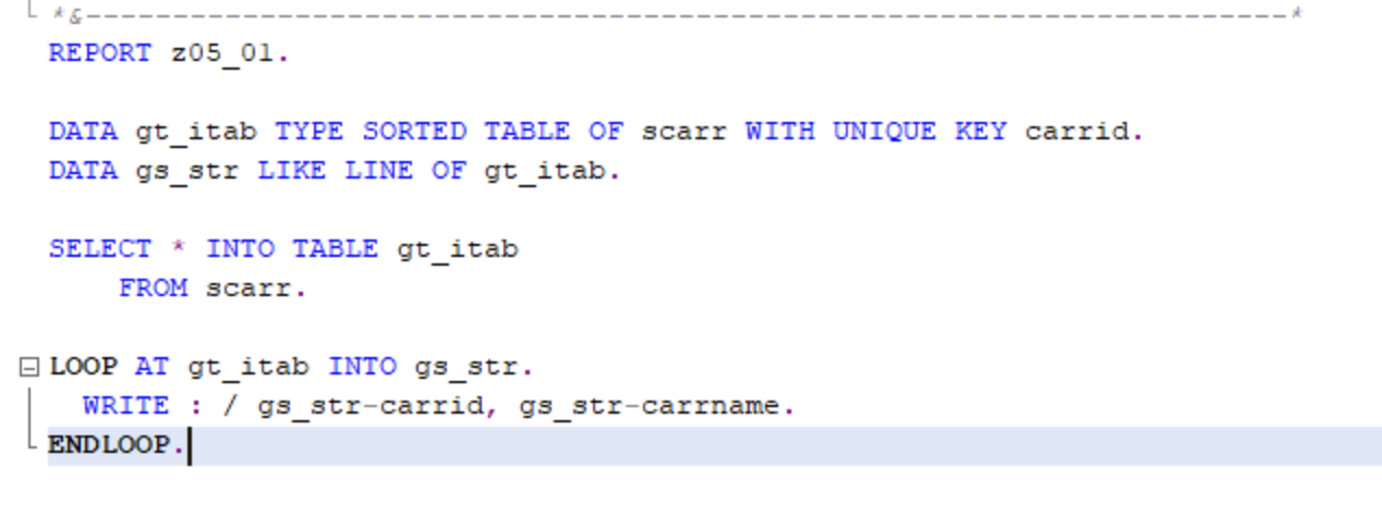 LOOP AT flight. WRITE flight-name. ENDLOOP. |