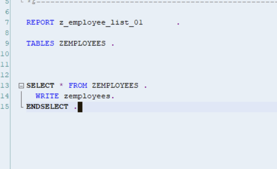 프로그램이 실행될 때, Tables문장은 ABAP 딕셔너리에서 정의한 Z_EMPLOYEE_LIST_01 테이블 구조 기반으로 메모리에 테이블 구조를 생성한다.